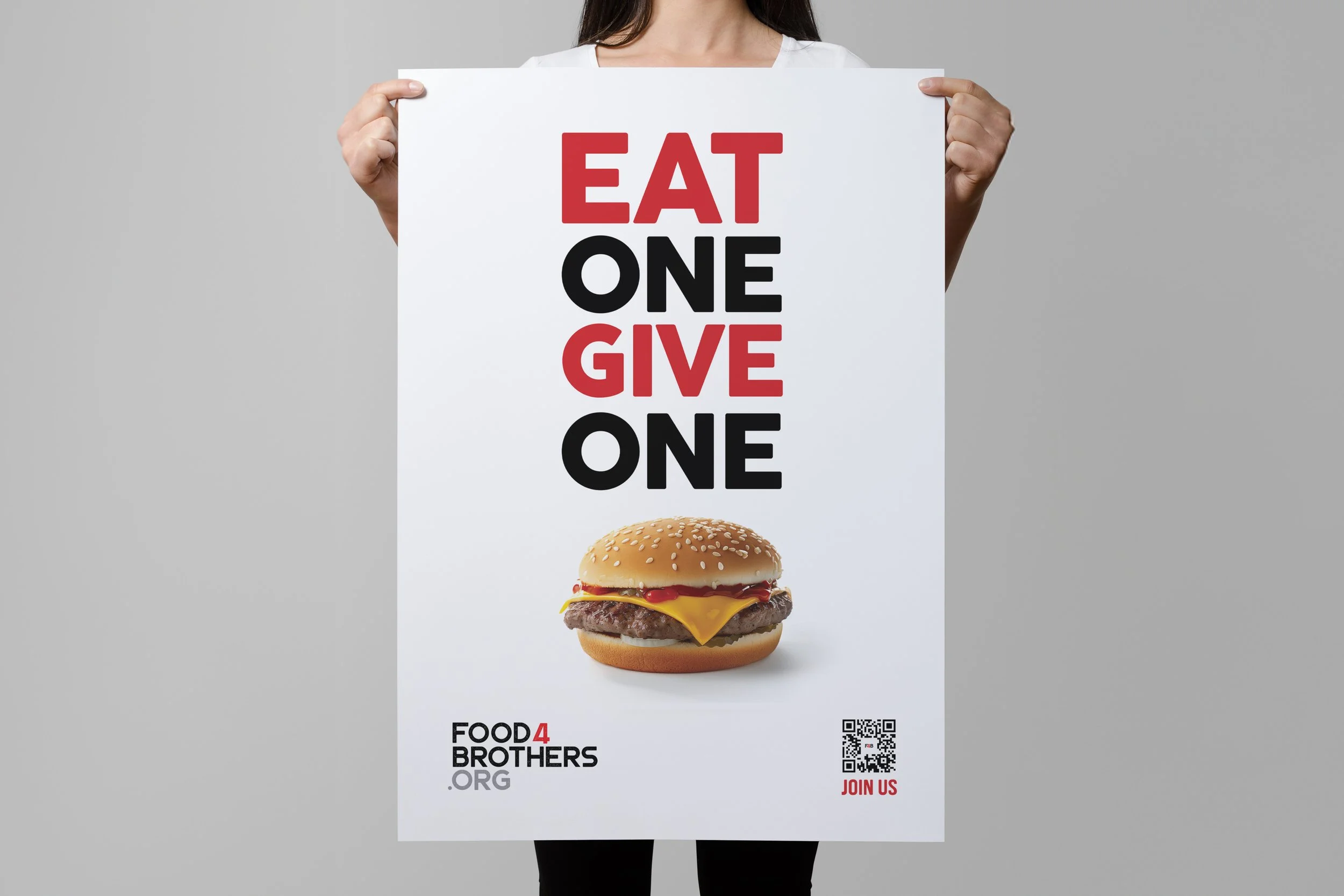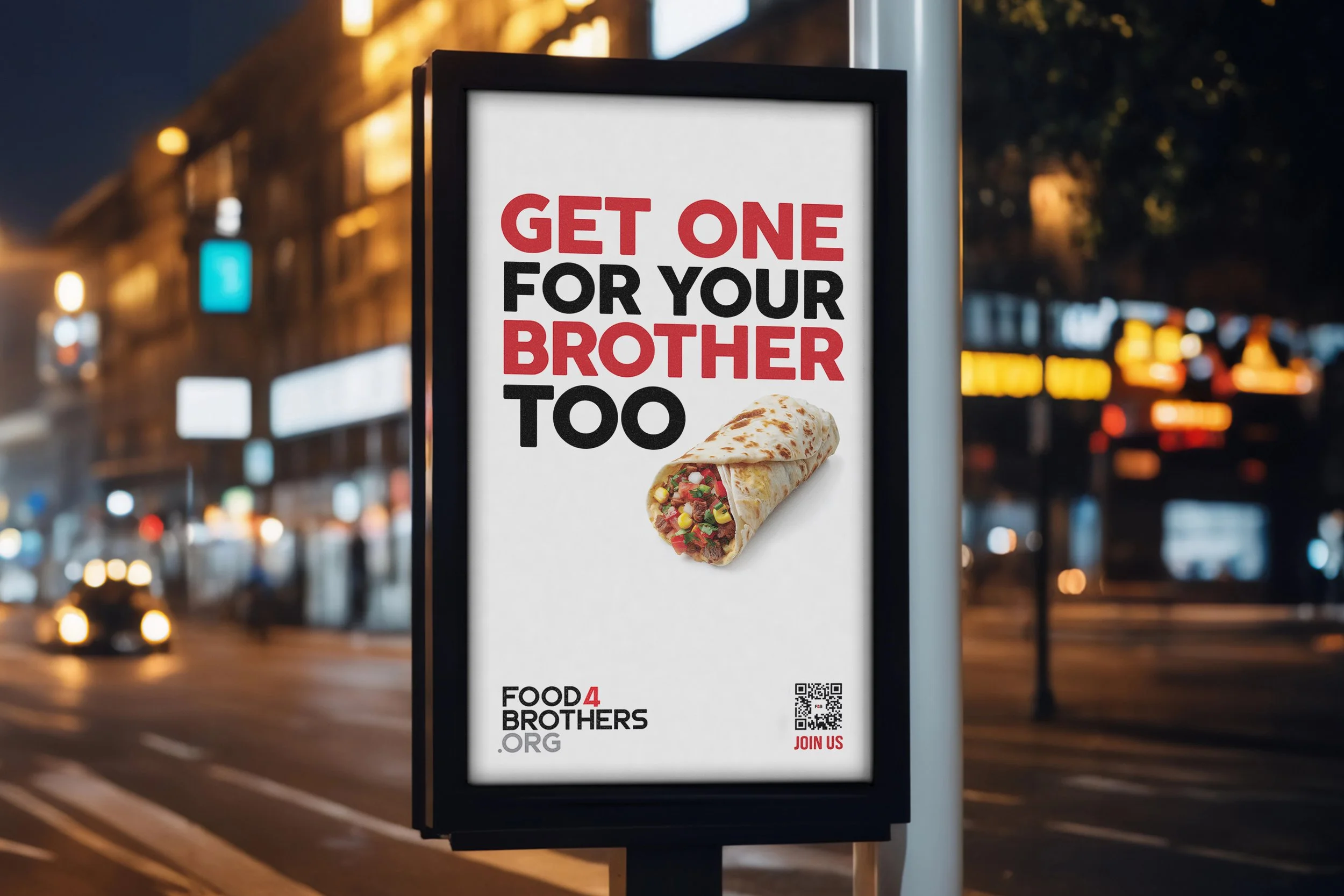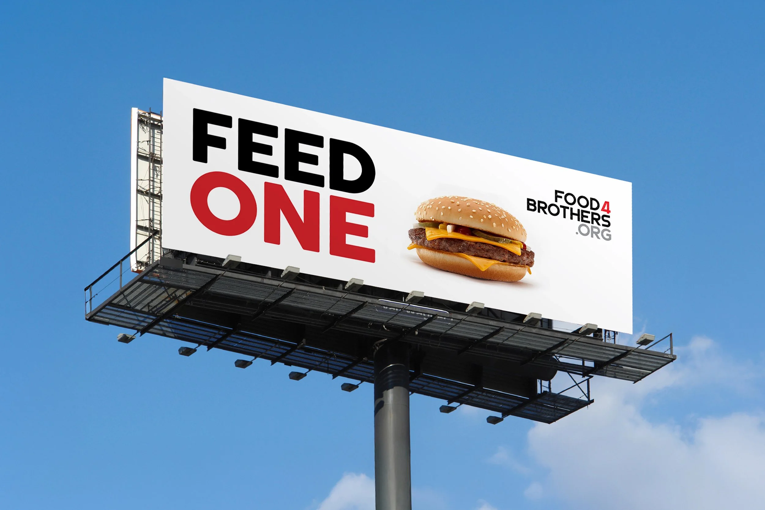 Through eye-catching visuals reminiscent of fast food campaigns and the red and black colors of Food4Brothers, the campaign expands across street signs, posters, stickers on drive-thru windows, and billboards. Food4Brothers calls on communities to join together and help one person at a time.