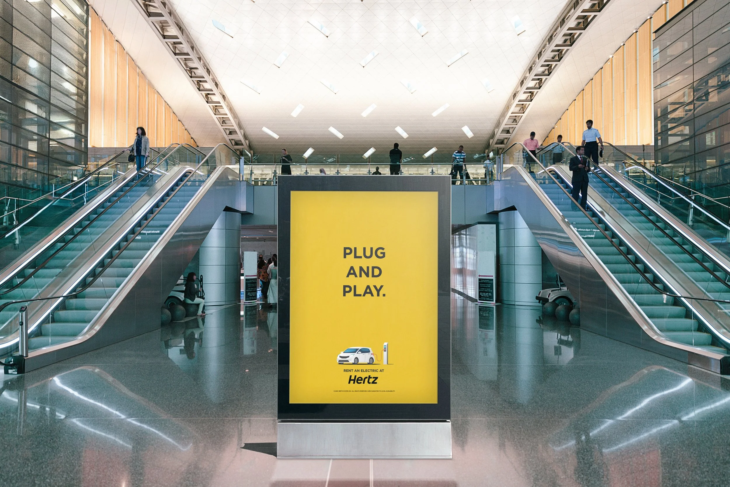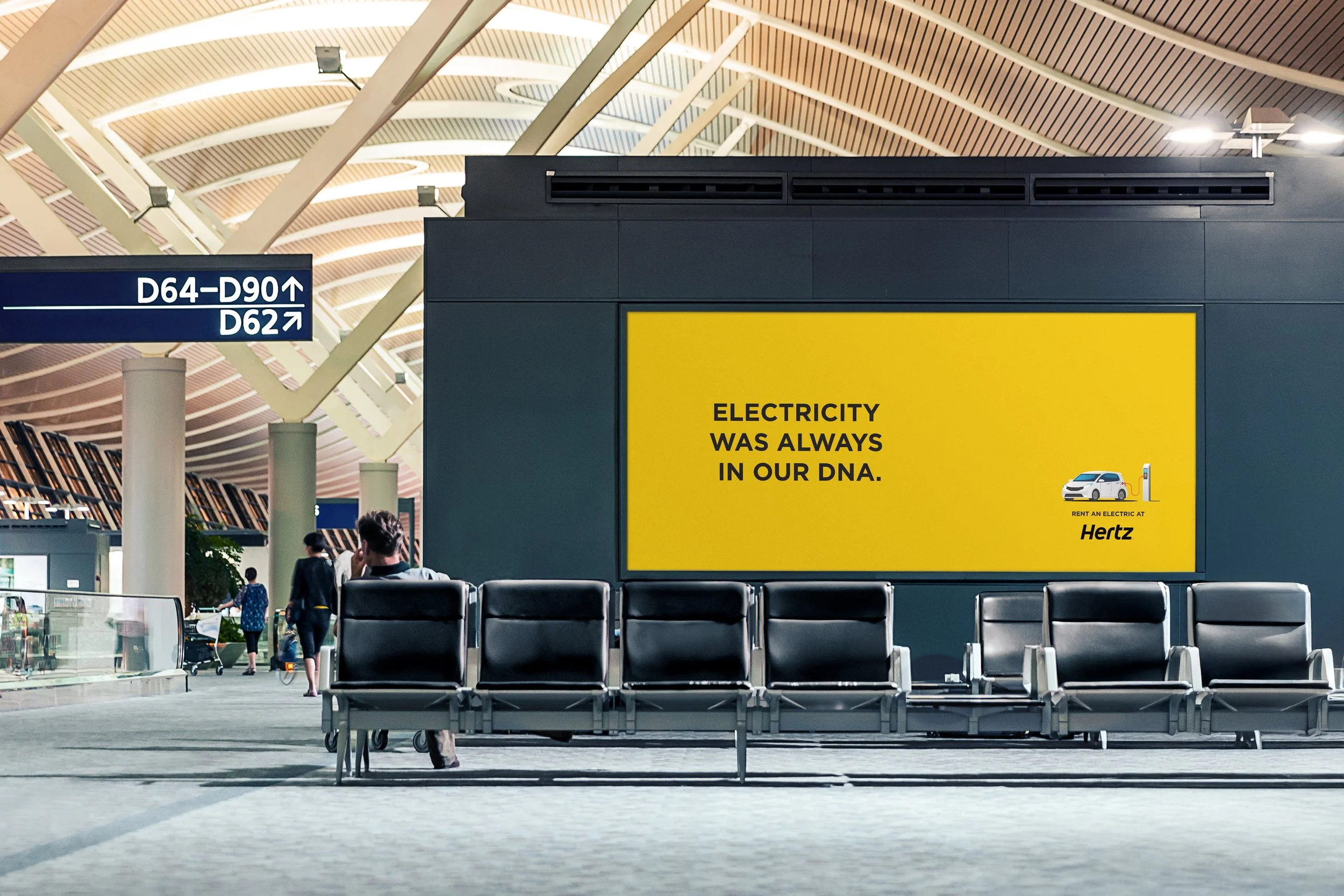 This campaign draws inspiration from the brand’s name, leveraging its vibrant yellow to evoke energy and sustainability. Bold, modern visuals take center stage, with billboards around airports and signs inside terminals strategically placed to catch travelers at the ideal decision-making moment. The design features clean layouts, dynamic typography, and a playful illustration of a generic electric car being charged, offering a neutral yet captivating visual representation of the fleet. The result is a cohesive, eye-catching campaign that underscores Hertz’s dedication to electric mobility while making a striking impact in high-traffic spaces.